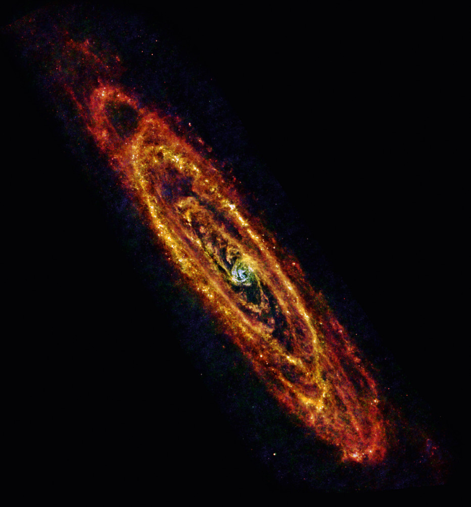 ▼ 这张照片是我们的“姐妹星系”仙女座,由赫歇尔空间望远镜摄于2013年。仙女座距离我们253万光年远,是肉眼可见的最远星系,但是只能在地球上最暗且没有光污染的洁净天空中才能看见。