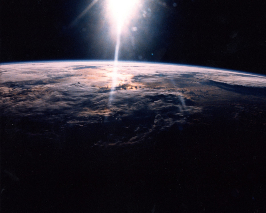 ▼ 这张照片摄于1989年,由当时发现号宇宙飞船上的航天员用一个35毫米摄像机拍摄。太阳光射到地球之上,地球被像蘑菇一样的云层包裹起来。大气层中的最高处距离地表差不多31英里(50公里),看起来是暗蓝色。