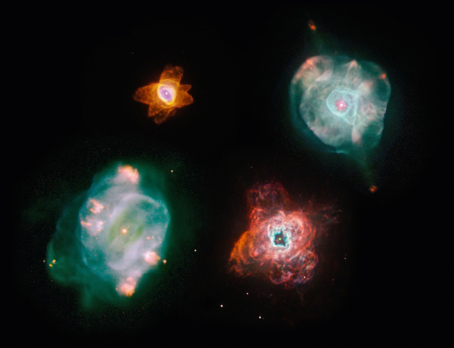 ▼ 这张合成图里是4个距离地球7000光年的星云,由哈勃空间望远镜拍摄。2007年2月,广域和行星摄像机2号(现已不再使用)拍下了这些照片,展现了不同形状、不同特征和化学过程的集合图,为我们提供了大量关于行星死亡过程和及过程中所产生的物质的信息。