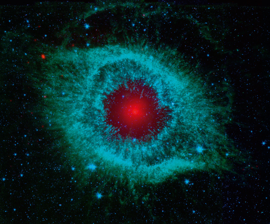 这张照片由斯皮策空间望远镜摄于2010年,在红外光下,气层外部表现出了蓝绿色。而中间的红色则是当行星死亡时最后一层爆炸的气体。中心稍微亮一些的红圈是一颗白矮星周围的星盘,这个星盘似乎由这颗星星周围的彗星汇聚与此构成。当一颗行星的外层开始爆炸时,它的行星和彗星就会向彼此倾斜,然后产生行星碎片和彗星的雹暴。