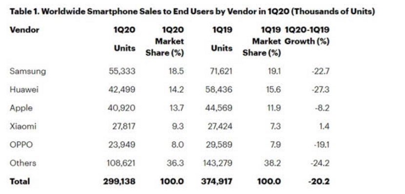 市场调研机构Gartner今日公布全球智能手机销售数据显示,2020年第一季度全球智能手机出货量2.99亿部,同比下降20.2%。具体来看,OPPO在全球市场份额为7.9%,排名第五,跑赢大盘。