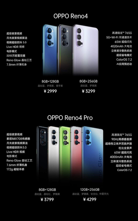 具体配置上,OPPO Reno4 系列继承了Reno系列影像强劲、视频突破的产品亮点,在OPPO Reno4 Pro上,更是以旗舰级的影像配置和全新的自研影像算法,推出“超级夜景视频”。除此之外,此次OPPO Reno4的优势还在于全系配65W 超级闪充,厚度仅有7.6mm,还用上了Reno Glow晶钻工艺。