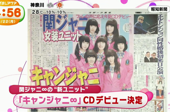 日本杰尼斯事务所能够做到每个人都能女装示人,少不了粉丝们深厚热烈的拥护。以成功让音乐CD《慎吾ママのおはロック》大受欢迎的香取慎吾为首,正月时代剧《雪之丞变化》(NHK综合台)中以美轮美奂女装示人的泷泽秀明、小崇小敏主持的综艺节目《お試しかっ!》(朝日影视)的《Aniコレ》(2013年12月1日播出)中,与加贺美圣良比美,取得压倒性胜利的手越佑也等等,要真的说起来,真的是数都数不完。说到“関ジャニ∞”的话,手游《CANDY SODA》的宣传片中装扮成欢快活泼的女高中生,作为女子团体“キャンジャニ”推出了属于“她们”的出道CD。娱乐杂志《Myojo》(集英社)推出的ジャニーズJr.的女装《Jr.少女图鉴》也是大受欢迎。