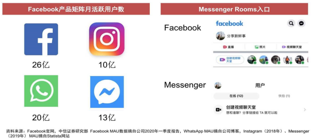 在多渠道方面,Facebook有强大优势,Facebook用户可以在Messenger App及Facebook新闻推送群组和活动页面上创建并分享聊天室。同时Facebook计划近期在其旗下Instagram Direct、WhatsApp及Portal软件上增加视频聊天室创建、分享渠道。