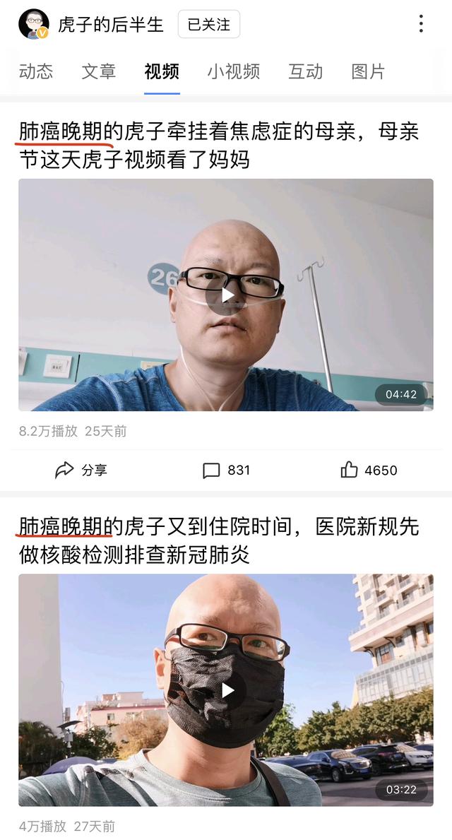 事情是这样审的,“虎子”真名付申虎,自称身患癌症4年多,现在肺内多发转移,全身骨转移,已经是癌症晚期,2019年12月开始,他在多个平台更新Vlog,记录“抗癌”日常。