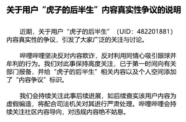 对此,B站立即给出回应,关于虎子争议性内容,已经向有关部门报备,并对他的个人空间及内容添加“争议”标识。等待后续查实,再配合司法机关处理。