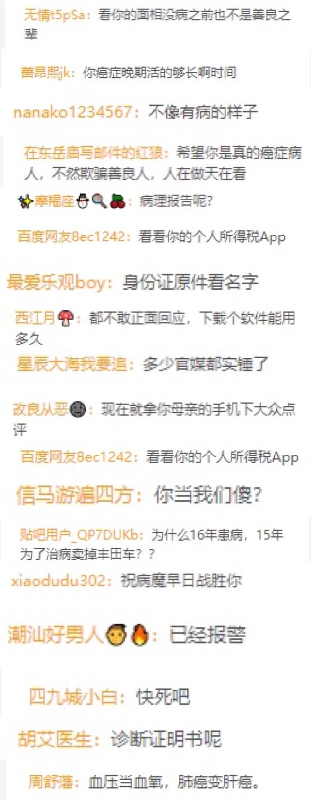 “快死吧”,“肺癌变X癌”,“祝病魔早日战胜你”等等,各种恶毒攻击连绵不绝。