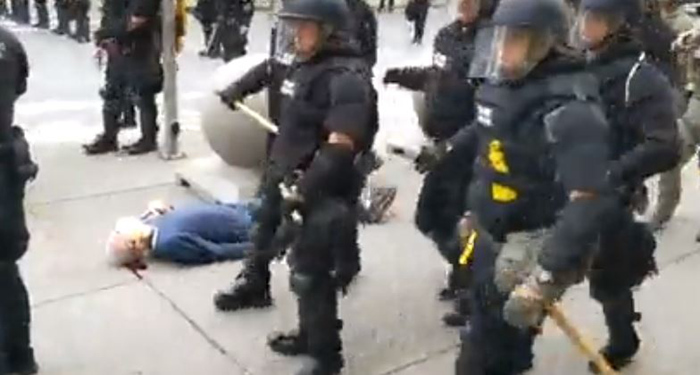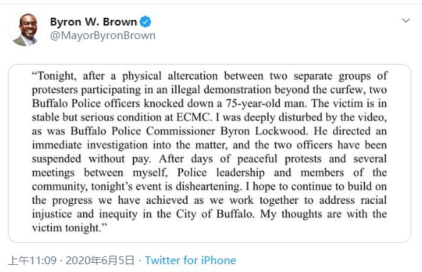 就在前一天的晚上,在纽约州第二大城市布法罗的反种族歧视游行中,警方在宵禁清场时推倒了一名75岁的白人男子。老人被推倒后,后脑直接触地,鲜血直流。但肇事警察并未实施救助。