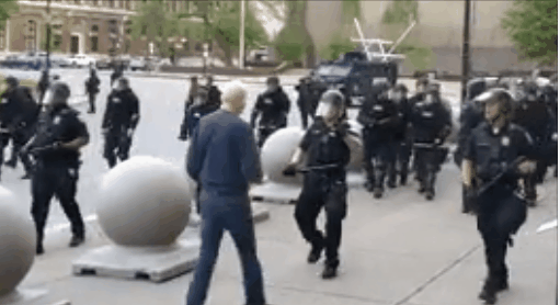 据布法罗当地广播电台WBFO拍摄的视频,周四晚宵禁期间,警方在尼亚加拉广场对抗议者进行清场。75岁的古吉诺(Martin Gugino)走向全副武装的防暴警察,试图与警察交谈。