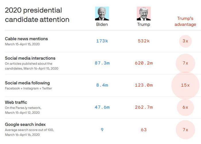 Axios新闻网对拜登和特朗普从3月15日到4月15日的媒体曝光和关注度进行对比,结果特朗普在每个环节都完胜。
