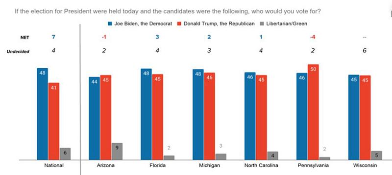 特朗普在亚利桑那州和宾夕法尼亚州略胜拜登,支持率分别为45%和50%,拜登在两州的支持率分别为44%和46%。