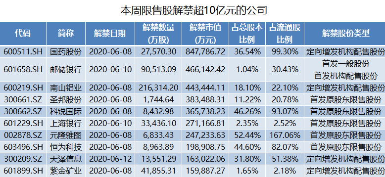 同时,解禁市值超过10亿元的上市公司合计有10家,前三为国药股份、邮储银行、南山铝业,均超过40亿元。