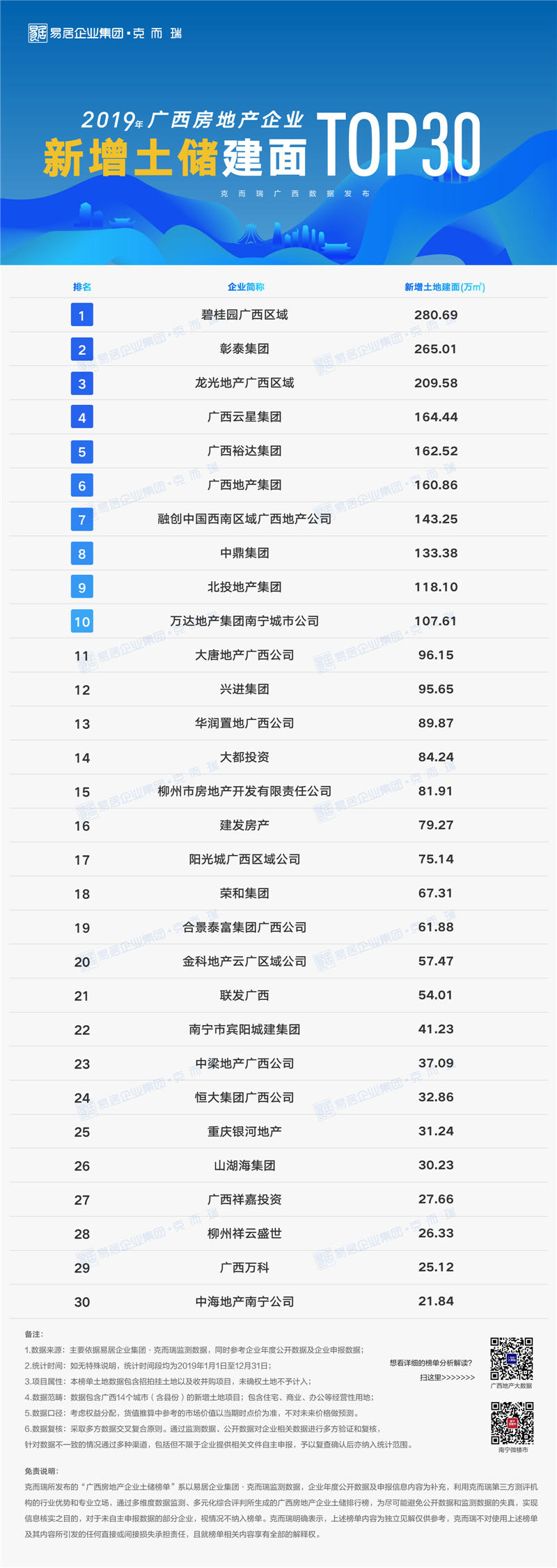 2019年广西房地产新增土储榜中,龙光、彰泰、碧桂园、建发、广西地产集团、阳光城、融创、云星均超百亿元;碧桂园、彰泰、龙光、云星、广西地产集团、融创、中鼎、北投地产集团、万达新增土储建面超百万平米;龙光、彰泰、建发、阳光城、碧桂园、华润置地、广西地产集团、大唐、兴进拿地金额都超过30亿元。