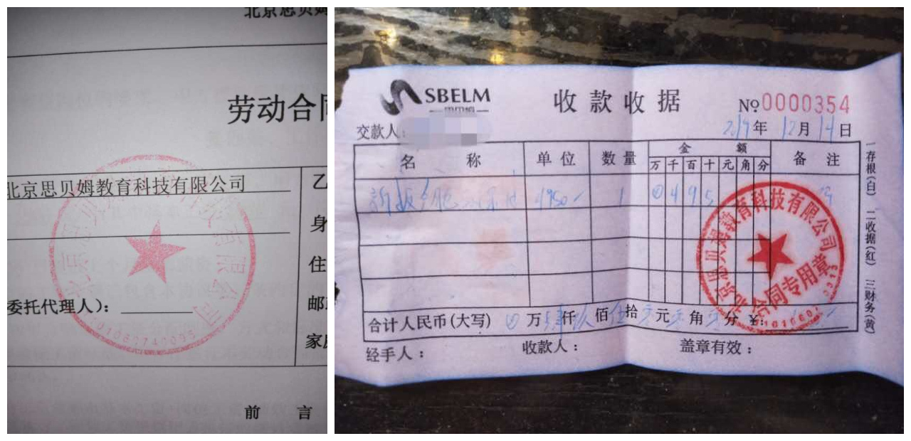 据曾咨询过思贝姆加盟的家长了解,其品牌前身是博佳机器人,但由于博佳总部让加盟店缴费,几位中心校长随后不在使用原品牌,并成立思贝姆这一新品牌。一位从2018年购买其课程的学员家长告诉界面教育,其2018年缴费时,收款账户仍是博佳,合同和收据上的企业名则变更为思贝姆。