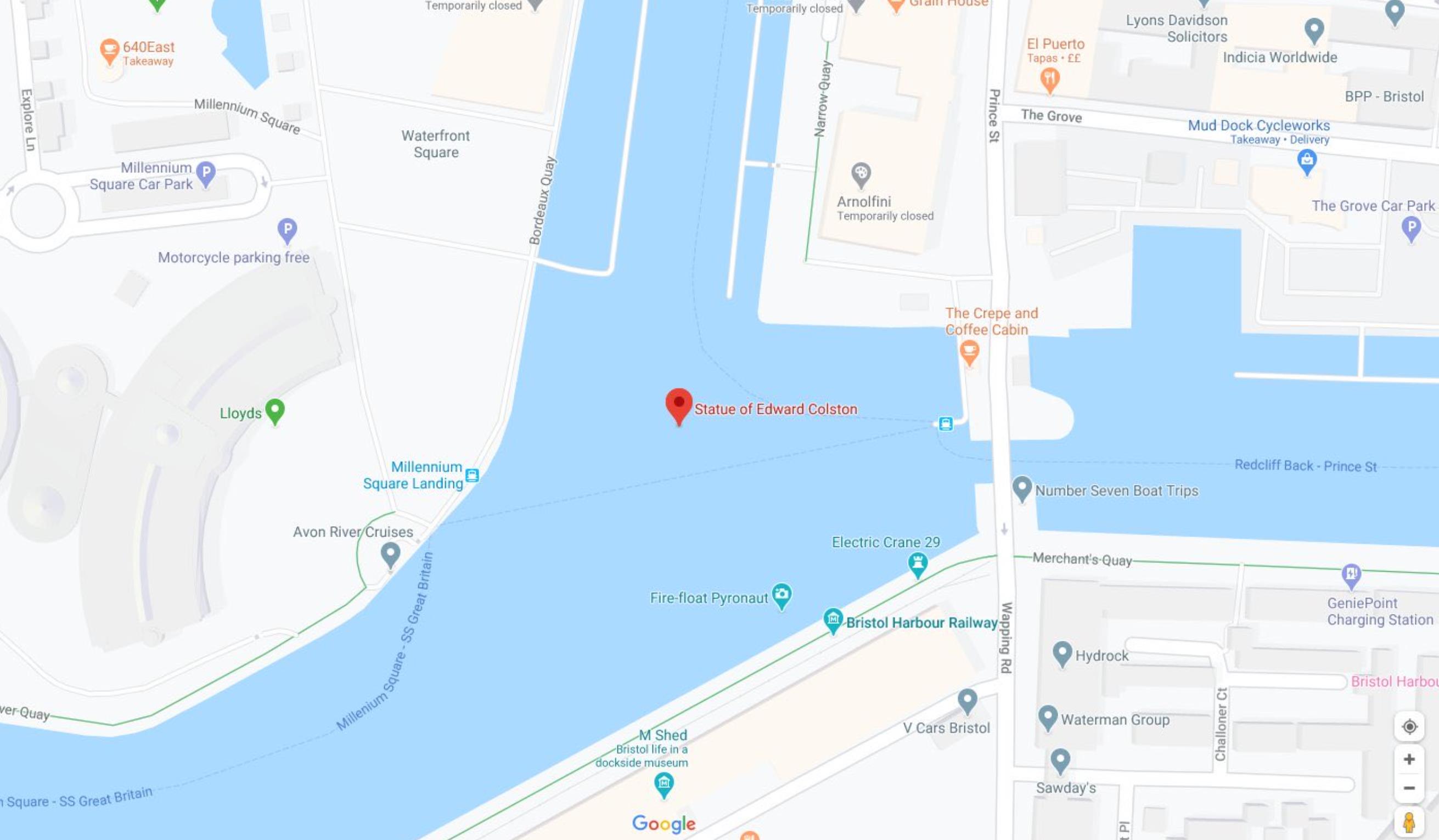 最引人注目的抗议活动是,布里斯托一名数世纪前非洲奴隶贩子的雕像被抗议者推倒,又被扔进当地港口。在谷歌地图中,商人爱德华·科尔斯顿(Edward Colston)的这座铜像已被重新定位至当地的河中。