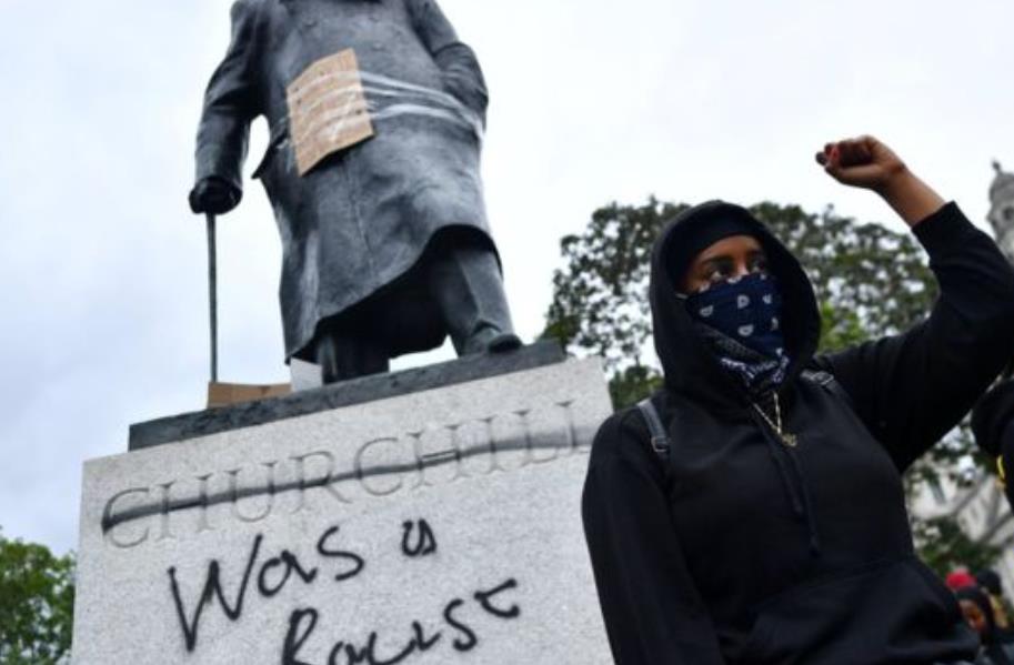 在伦敦国会广场,英国前首相丘吉尔的雕像也被喷上“种族主义者”的涂鸦和“黑人命也是命”的标语。