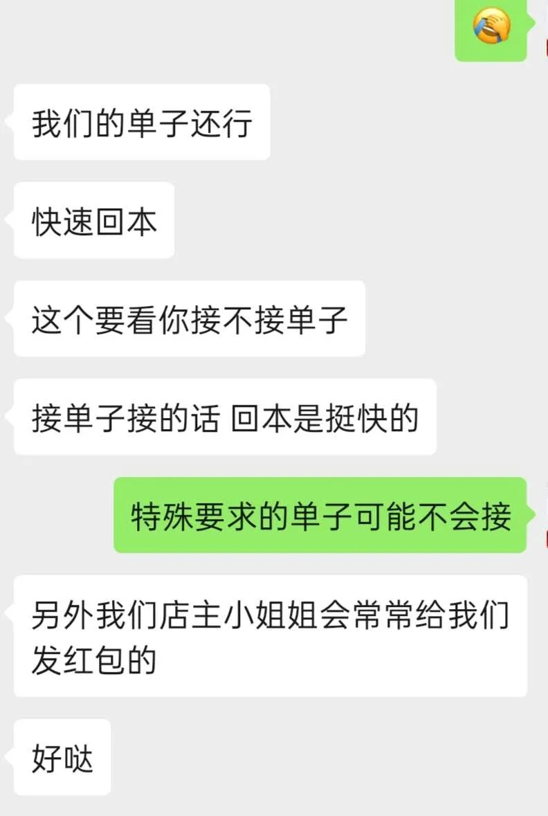 在群里一周的时间,因单子的数量和“质量”的原因,我并没有接到合适的一单。我也在怀疑是不是因为自己“乱入”了一个成立不久的、缺乏平台监管的“虚拟恋人”群,才会导致遇到这么多灰色单子。于是我回到淘宝,开始询问多家店铺客服,是否招聘虚拟女友,有些店铺明确表示不招人,有些店铺则表示只招收“有相关工作经验的”。