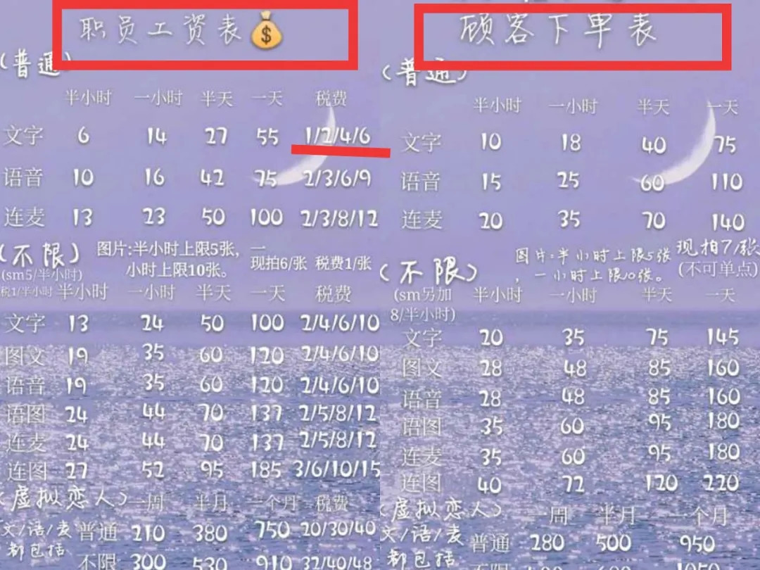 恋人服务的售价分为两版:一版为客人购买的价格;一版则为下单、接单人实际的工资收入。客人下单的全额由接单人、下单人以及团费这三部分瓜分。例如,一天普通的虚拟恋人顾客下单价格为44元,其中22元为接单人的工资,另外22元由下单人支付5元团费(或称税费)给“恋人馆”,然后自己获得17元的收益。