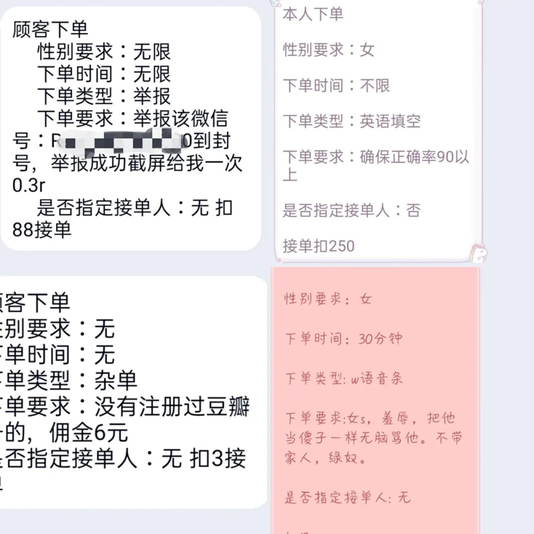 进群的一周时间里,除了多数“带颜色”的单子以外,甚至还包括“举报一个人的微信号到封号”、“狠狠的骂自己、骂别人”这种过分要求的杂单,这种单子的接单率相对较低,却也基本不会空单。