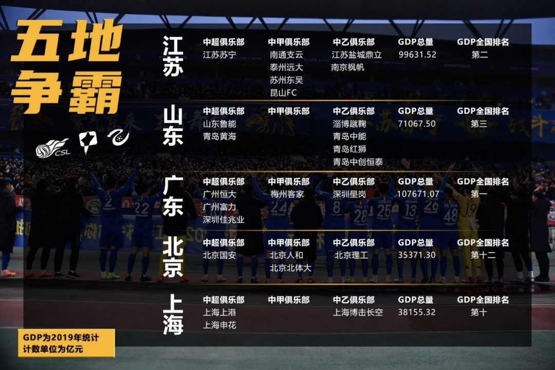 在中国的职业足球联赛版图中,2018赛季还有11支球队的东北地区,两年之后仅仅剩下四家。与之相对应的则是经济实力最强的粤、苏、鲁分别以5支、7支、6支职业球队,成为了前三甲,其中,江苏崛起的势头最为强烈。
