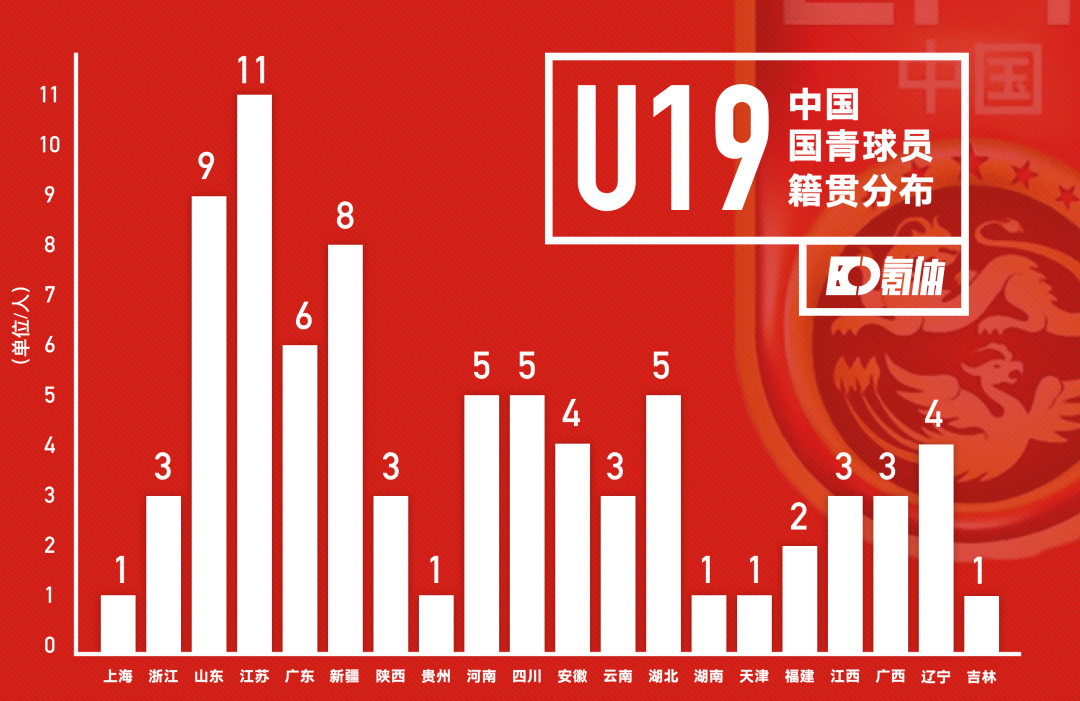 而拥有鲁能足校的山东,以及拥有恒大、富力两大青训基地的广东分别以9人、6人紧随其后。