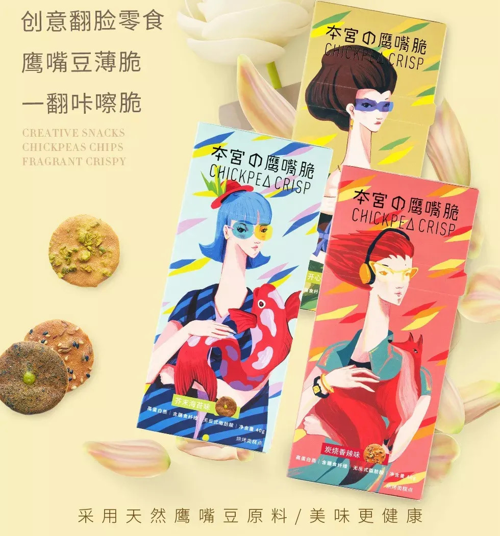 但要说国内第一家把鹰嘴豆作为零食原料的品牌还是本宫。该品牌在2018年时推出产品鹰嘴脆,上线仅10天销量破万盒。据品牌介绍,他们一开始只是卖下午茶点心,但后来有顾客反馈说店里的瓦片酥很好吃,但只能每次来店里才吃得到,于是,他们就把这款产品全新升级,加入有机鹰嘴豆做成鹰嘴脆。并且,品牌还请了知名艺术家和新锐设计师领衔操刀,为产品设计独特的外包装,这也是其后来成为网红产品的重要原因之一。