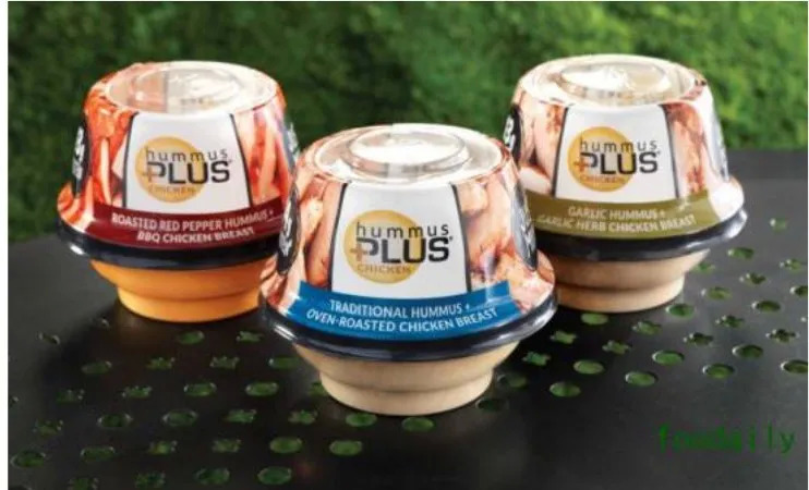 美国初创食品品牌Hummus Plus首推五款鹰嘴豆泥的创新食品,分别是蒜蓉鹰嘴豆泥+墨西哥风味鸡胸肉,蒜蓉鹰嘴豆泥+蒜蓉草药鸡胸肉,烤红辣椒鹰嘴豆泥+烧烤味鸡胸肉,日晒番茄干鹰嘴豆泥+烤箱烤鸡胸肉和传统鹰嘴豆泥+烤箱烤鸡胸肉。每包8盎司,根据品种不同,每包含24-28 g蛋白质和10-12 g纤维。