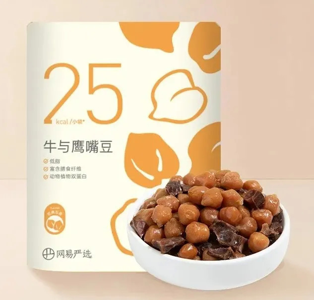 前两天,网易严选也推出一款鹰嘴豆零食新品——牛与鹰嘴豆,主打健康营养的休闲零食。新品巧妙搭配食材,以低脂肪的牛腱肉搭配“豆中之王”鹰嘴豆,动植物双重蛋白,同时补充膳食纤维。产品采用独立包装,每一小包热量仅有25kcal,约1/3个苹果的热量,增加饱腹感的同时也可以帮助体重管理,目前有经典五香和红烩番茄两种口味。