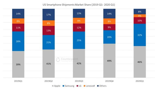 根据Counterpoint提供的数据,今年第一季度,iPhone在美国的市场占有率依然高达46%。CIRP的报告显示,iPhone 11、iPhone 11 Pro和iPhone 11 Pro Max三款机型,在苹果手机中的销量占比达到了66%。换句话说,iPhone 11系列在美国一季度手机市场上,拿下了超过三成的份额。作为去年9月登场的机型,现在取得这样的成绩,还是相当不错的。