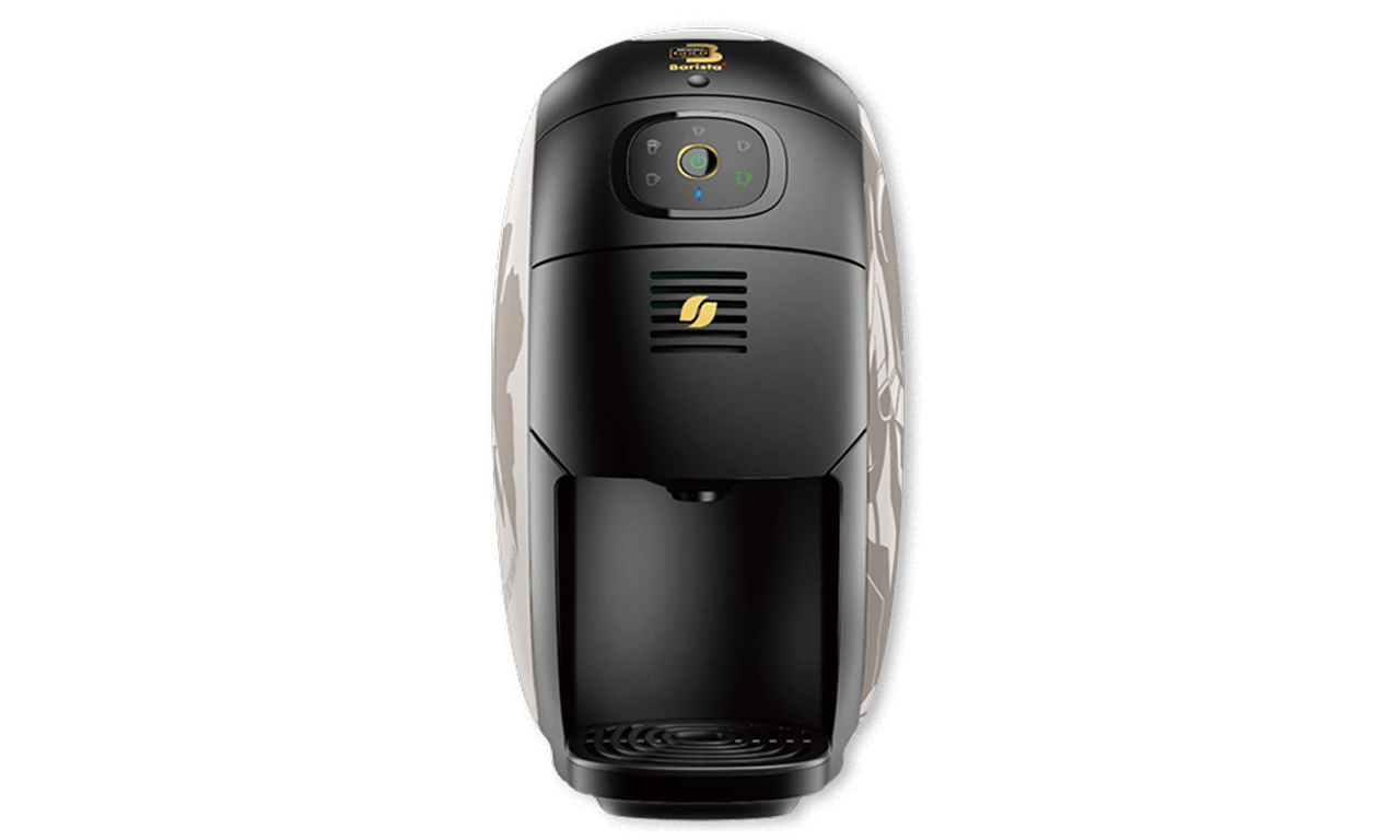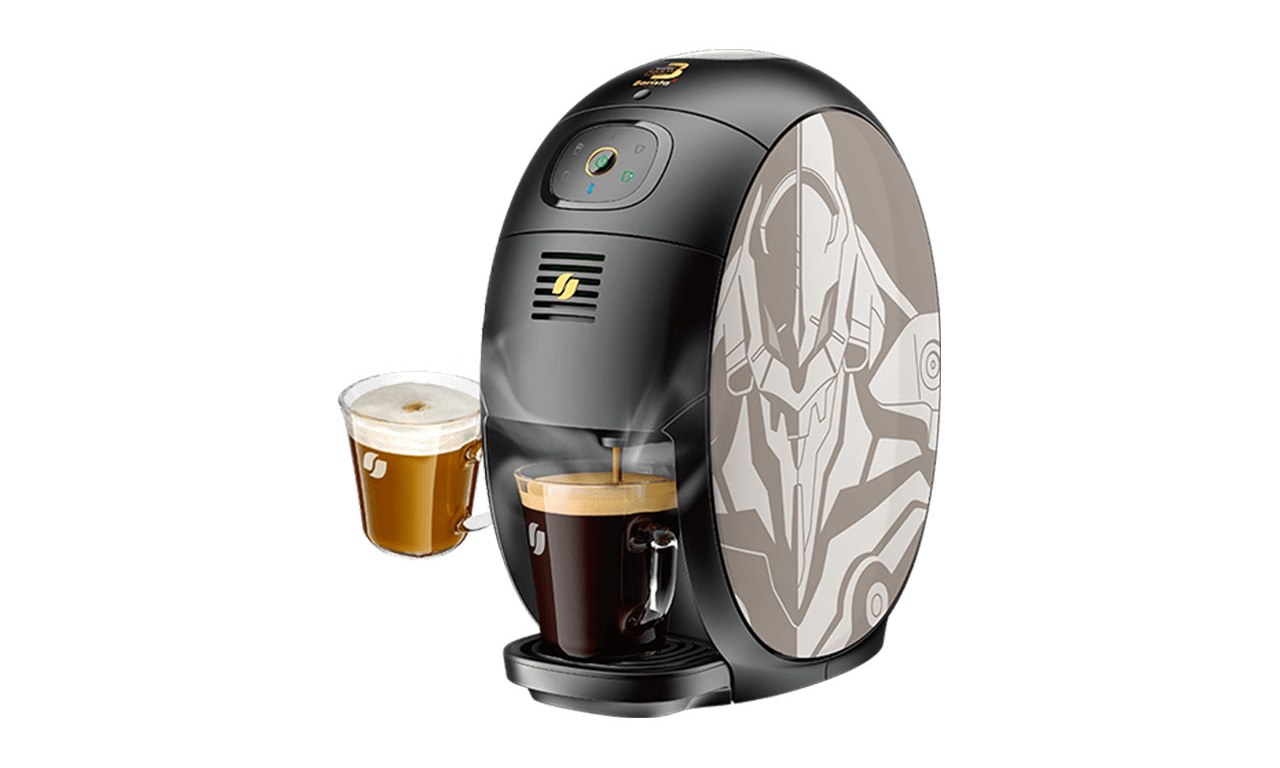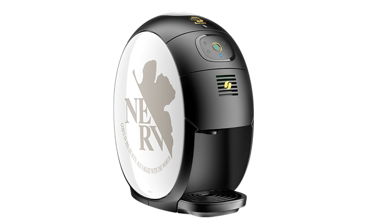 这款咖啡机以雀巢的咖啡黄金混合款式为基础,在哑光磨黑的基调上,于侧面分别绘印上了动漫中的机器人角色图案和“NERV“的枫叶标记。认真地说,咖啡机本身立体浑圆造型,就带有着极强的未来感,与《新世纪福音战士》中想要表达的末世主题也非常契合,想必人们使用其制作咖啡的时候也能感受到满满的机动仪式感。
