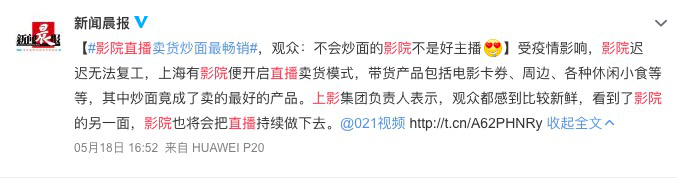 从五月中旬开始,山东的万达影院就开始了开业前的宣传工作,随后上海电影集团旗下影院也开启了直播卖货的模式,清除上半年卖品库存的同时,也希望通过这些“热身”活动,持续引起观众对电影院的关注。