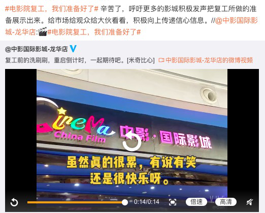 最近,越来越多的影院也加入了一个名为“影院复工,我们准备好了”的微博话题,纷纷晒出了自家影院准备复工的情况。