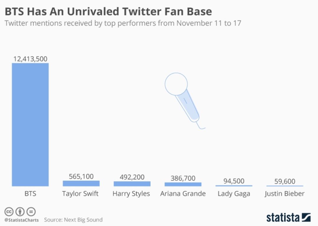 据Next Big Sound报道,2019年11月11日至11月17日期间,BTS被提及次数超过1241万次,而在同样的时间里,拥有8510万关注者的歌手Taylor Swift被提及约56万次。今年5月3日,成员田柾国翻唱了《Never Not》一曲,该视频在推特平台发布后仅48个小时内,就收到了高达60万条评论,一举创下了平台的历史纪录。