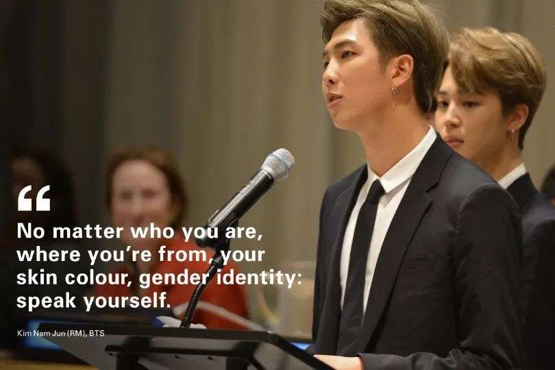 基于如此庞大的粉丝群体,防弹少年团也拥有着普通KPOP艺人难以企及的资源。早在2018年,防弹少年团就登上了美国《时代周刊》杂志封面,配文写到"下一代领袖",并引用了美国日裔DJ Steve Aoki的话,"(防弹少年团的歌曲)不用英文迎合全球化"。同年,在联合国大会活动上,防弹少年团成员金南俊发表了一段近7分钟的演讲,阐述了自己如何从一个韩国小城市为起点,一步步成长为歌手的人生经历,并呼吁"无论你是谁、来自哪里,也无关你的肤色和性别,你要为自己发声"。