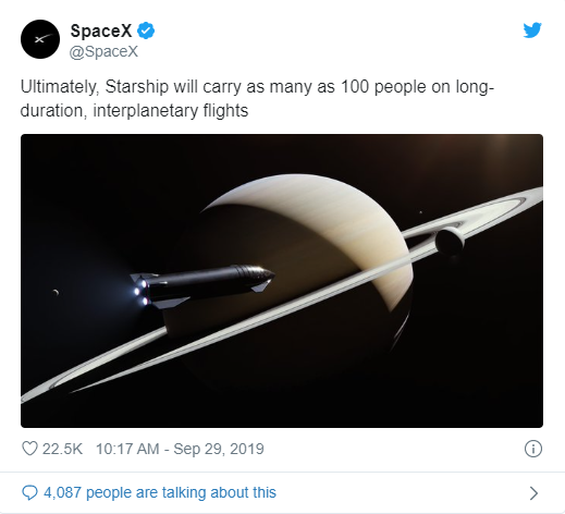 ▲SpaceX官方发表推特表示,最终,“星舰”星际飞船将搭载100人进行长时间的星际飞行