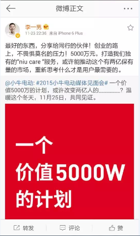 当事人李一男于23日晚间转发小牛电动微博。以下是其微博截图: