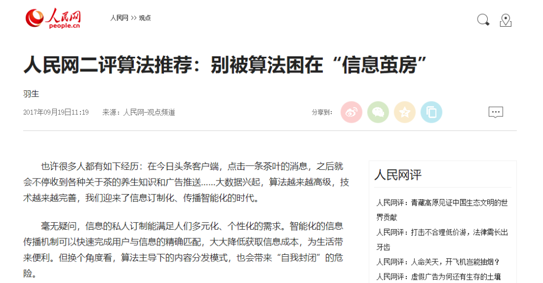 但此后算法推荐本身一直争议不断。在2017年9月,人民网特意用三篇社评的篇幅批评了今日头条这类新闻应用的“算法推荐”。社评里自然首先肯定了算法推荐顺应时代潮流,满足人们个性化、多元化的信息获取需求,但又专门指出了以下的问题: