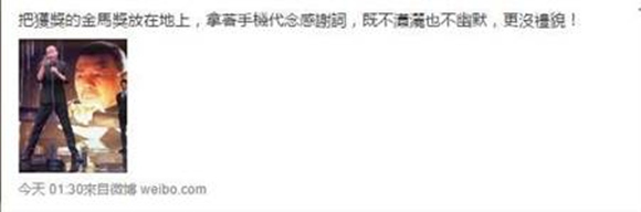台湾著名音乐制作人小蟲(陈焕昌)在微博发文,狠批道:“把獲獎的金馬獎放在地上,拿著手機代念感謝詞,既不瀟灑也不幽默,更沒禮貌!”。不少网民也纷纷对此发表评论,怒喷“太失礼了”“简直侮辱了金马奖”也有的说“大可请主持人或者工作人员代为保管呀”。