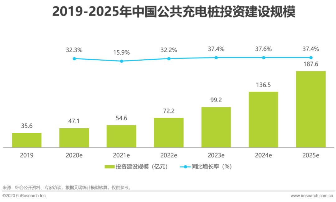 由于新基建的提出,充电桩成为助力国家稳增长的重要力量,充电桩投建速度有望加快,整体充电桩制造市场呈现周期向上的特征。同属于新基建范畴内的5G,大数据和人工智能的应用都可以加快新能源汽车的推广,从而带动充电桩建设,加速推动充电桩行业发展;窗口期也将缩短,优胜劣汰即将加速。经保守测算,以60kW直流桩和7kW交流桩为主,2025年中国公共充电桩市场投资建设规模将达187.6亿元。