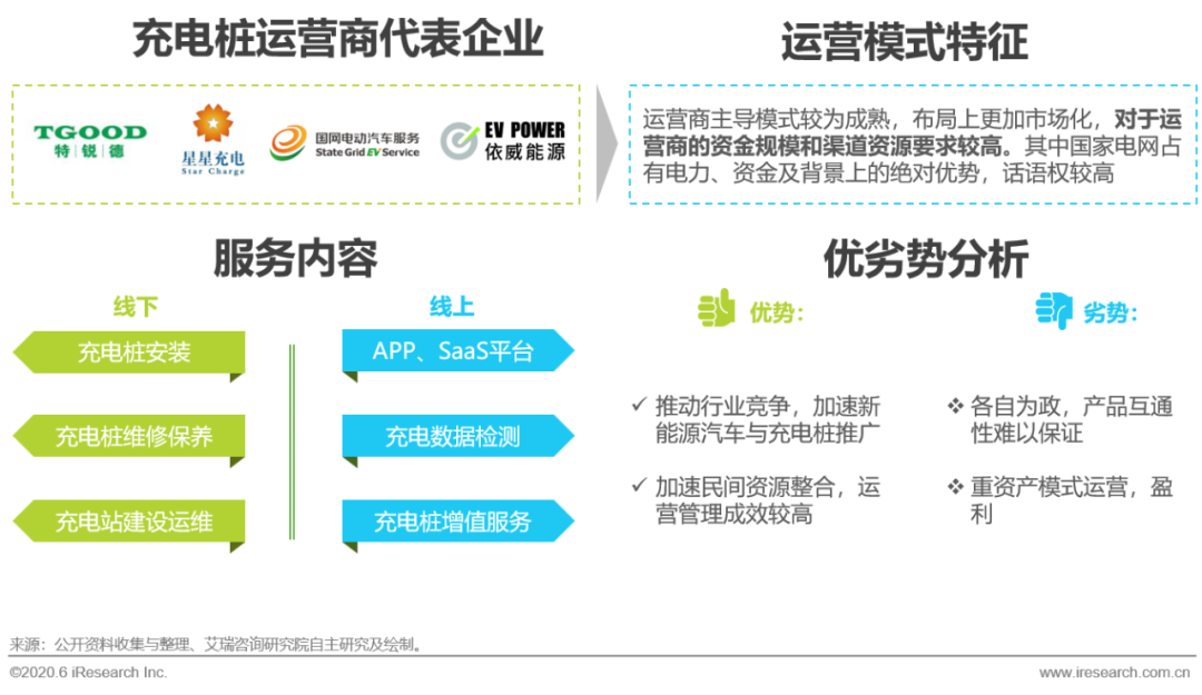 运营商主导模式指由运营商自主完成充电桩业务的投资建设和运营维护,为用户提供充电服务的运营管理模式。同时运营商也在逐渐建立SaaS平台,可同时面向用户和商家。运营商主导模式的服务内容和场景布局方面更加市场化,可有效推动行业竞争。国家电网因其强大背景在充电桩行业具有绝对的话语权。