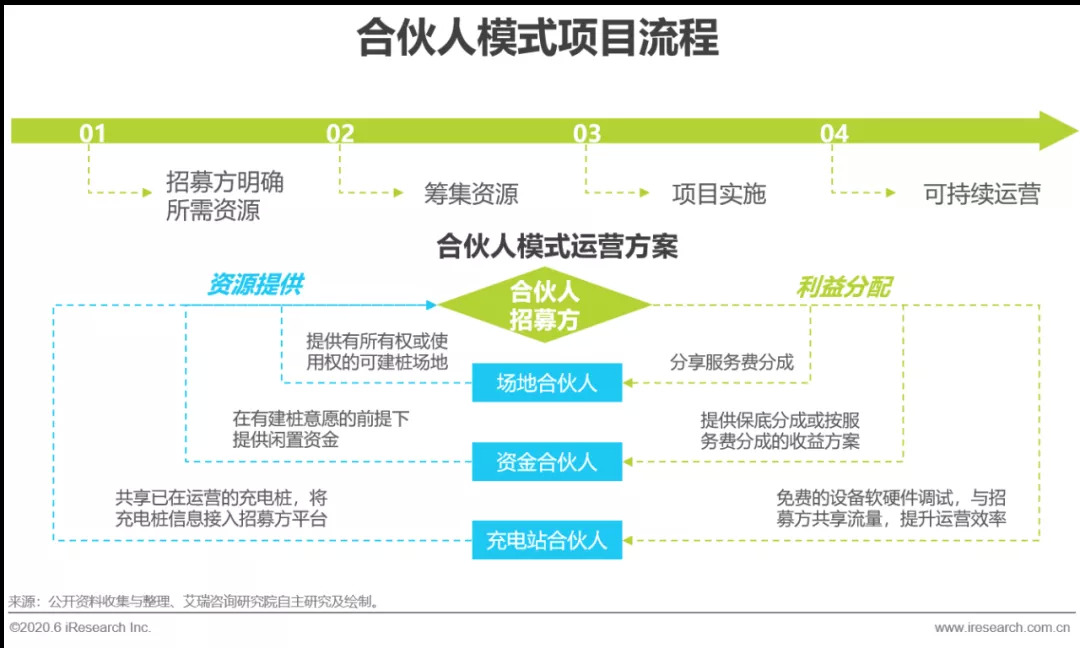 合伙人模式指由资源募集方提出需求,招募拥有所需资源的集团或个人共同进行分散式充电桩和公共充电站的建设运营,达成资源的合理分配和利益共享。合伙人招募方需要在行业中有强大的影响力和背景才能聚集到多方资源。与独立建桩运营相比,合伙人模式将明显改善运营商重资产的运营现状,有效盘活充电桩上下游的产业资源,拓展社会多方的合作,有望对充电桩行业格局产生积极影响。国家电网、星星充电和小鹏汽车等先后尝试合伙人的招募,国家电网因拥有绝对的电力资源与背景,在此模式中优势明显。