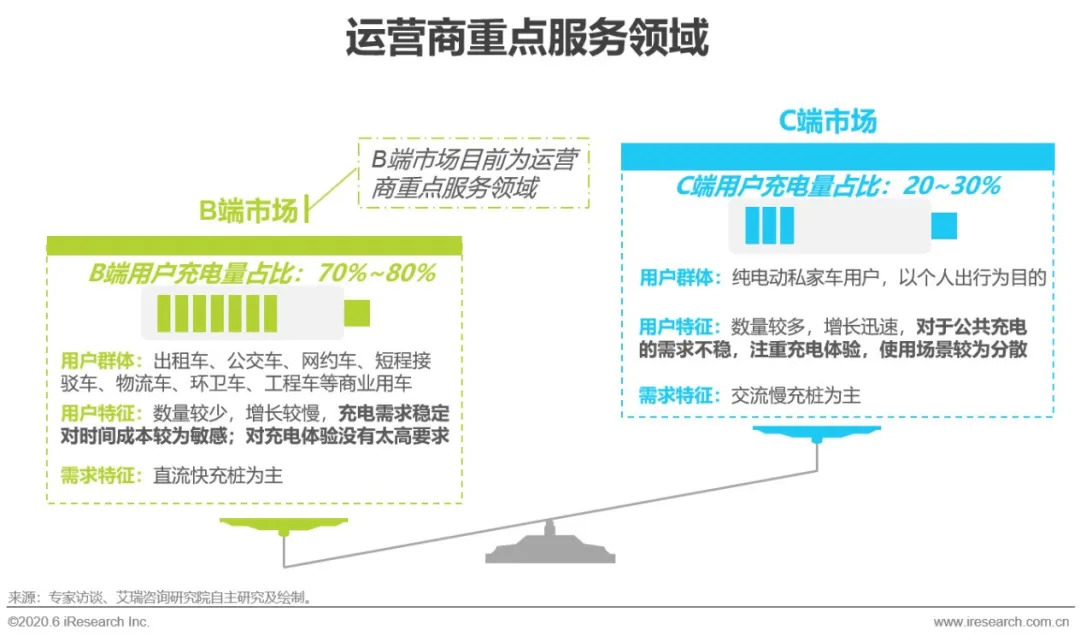 在服务领域方面,公交车、出租车等B端领域的电动化发展已成定局,虽然数量较少但由于充电需求量大且稳定,但可带来稳定的现金流,因此成为多数运营商在短期内的重点服务领域。尤其对于小型运营商来讲,本身诞生与新能源汽车下沉过程中形成的区域性市场并具有明显的主场优势;同时由于资源的匮乏,开拓区域性的B端市场可为其提供暂时性的立足之地。长期而言,B端市场的天花板较低,随着电动私家车的增长,运营商的服务重点将逐渐向C端转移,面向C端的精细化运营将成为企业关注的重点。