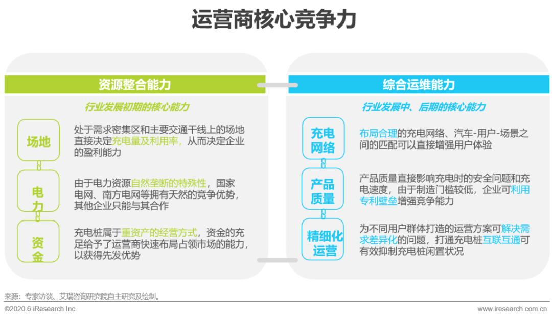 充电桩行业发展较晚,商业模式单一,制造方面门槛较低,因此目前的核心竞争力主要集中在投建时所必要的资源整合能力上。可以在短时间内拿到所需资源的企业便可在市场中占有一席之位,而充足的资金则可加快市场开拓的进程。随着市场的逐渐成熟和竞争的白热化,企业可将原有模式进行复制开拓更多市场,但企业的核心竞争力将从资源整合能力转变为综合的运维能力;合理的布局、产品的稳定性、运营方案的差异化和互联互通将吸引更多的用户及资本的青睐。因此在行业逐渐成熟之后,竞争将变成一场综合实力的较量。