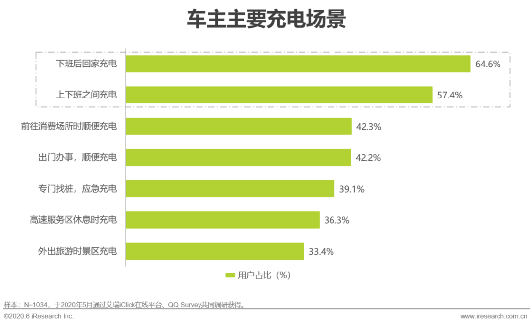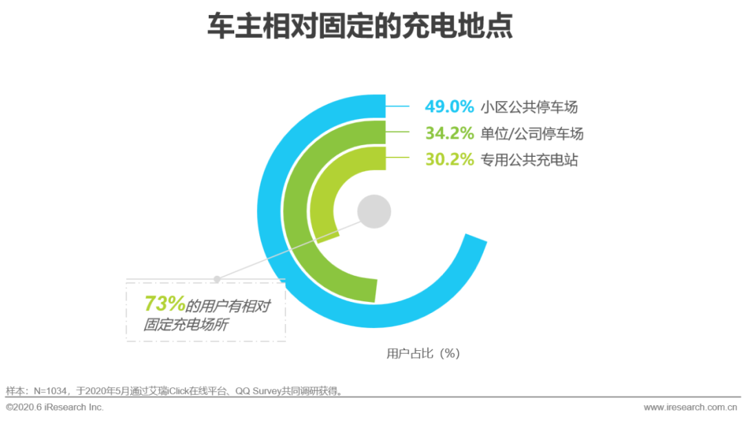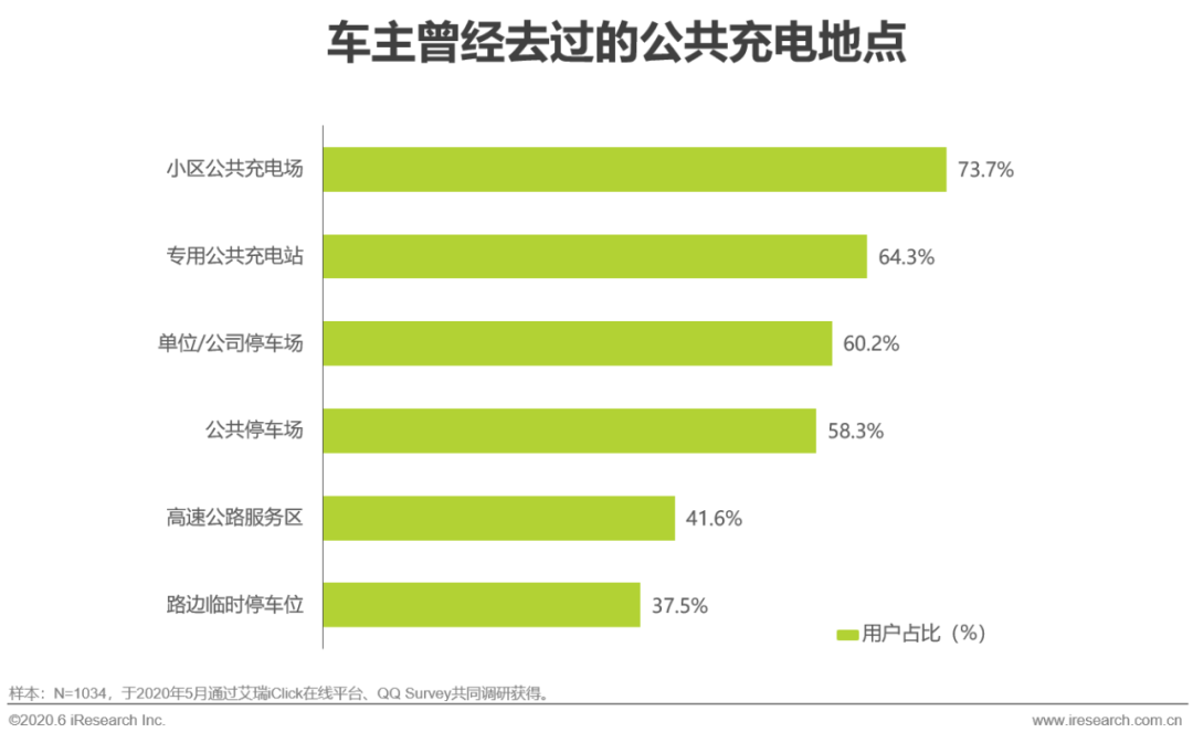 在所有公共充电桩建设场所当中,小区公共充电场、专用的公共充电站、单位或公司停车场和在商超、公园等地设立的公共停车场为大部分私家车主去过的充电地点。在高速公路服务区充过电的用户仅占41.6%;同时由于在路边车位停车时间久后易被罚款,仅37.5%的用户在此地点有过充电体验。同时,对于私家车用户而言,居住地点和办公地点为相对固定的充电场所。