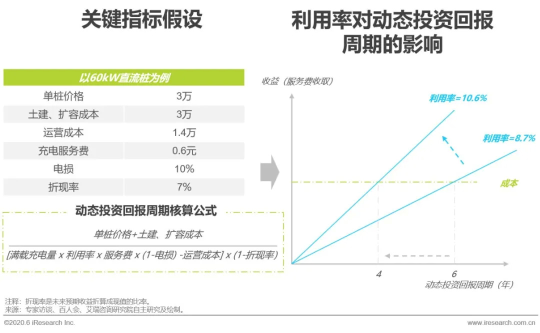 而激烈的竞争和用户对充电费用极为敏感导致服务费短时间内难以上升,因此单桩利用率成为目前运营商盈利的重中之重。经测算,在全国平均服务费为0.6元的情况下,利用率提升1.9%可以显著缩短两年的动态投资回报周期,而更加合理的选址布局和加大直流桩的投建为提升利用率的关键所在。