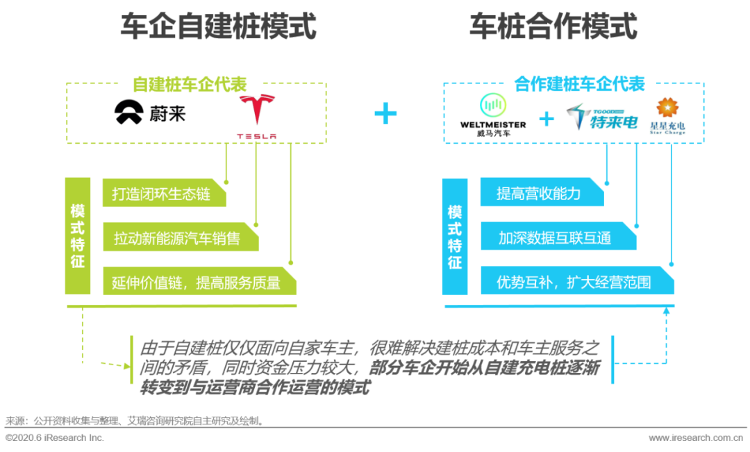 车企为提供更优质的服务,纷纷布局充电服务打造自家生态链形成闭环,将充电桩作为售后服务提供给车主更优质的充电体验;主要适用于较为成熟的电动汽车企业当中,对于资金和用户数量有较高要求。而充电桩的实际需求不断增加,车企在能源供给与技术方面相对运营商而言较为匮乏,转变思路寻求与运营商的合作共建或是未来更加合理的运营思路。