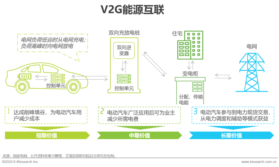 V2G:V2G可达成车辆与电网之间的能源互联,为未来的长期发展方向。