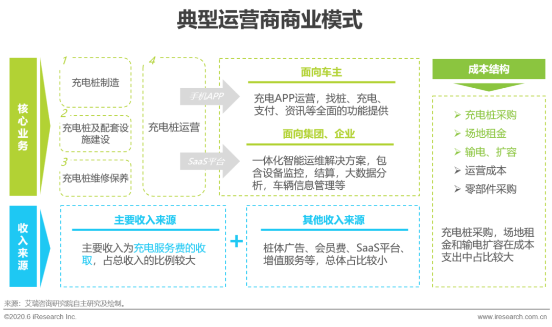 由于充电桩行业发展较晚,商业模式较为单一,服务费的收取仍然为其主要盈利来源。由于其核心业务需要与电池、整车厂商等高度配合,并且同时面向车主和企业,因此各路资源的开发及整合能力成为开展核心业务的关键,重资产的经营也使得压缩成本成为关键。