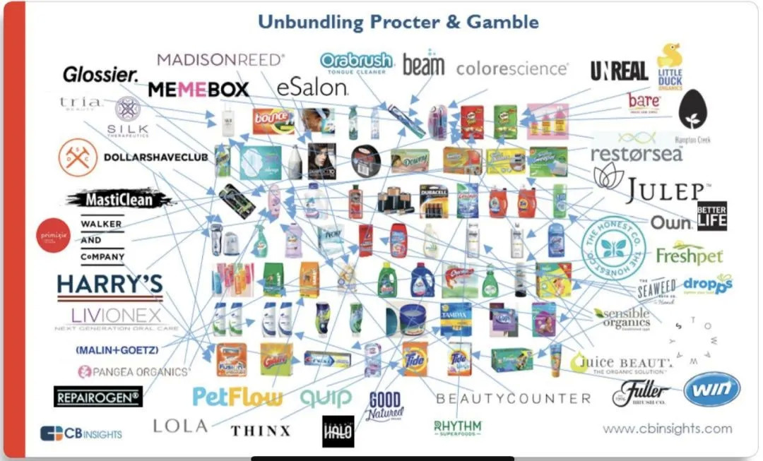 宝洁的细分品类都在遭受DTC品牌争抢赛道,图片来源:cbinsights