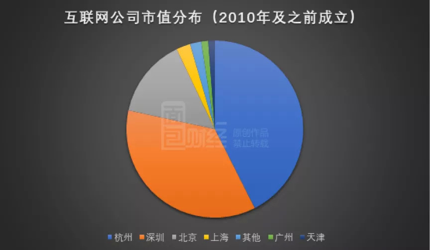 成立于2010年及之前的上市互联网公司总部分布在26个城市,总市值位居前三的城市分别是杭州(4.28万亿元)、深圳(3.61万亿)、北京(1.46万亿),三个城市市值占比分别约为42.55%、35.85%、14.51%。总部位居上海的互联网公司总市值仅有2575.22亿元,市值占比仅为2.56%,远远落后于杭州、深圳,与北京的差距也非常显著。